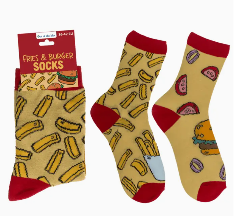 Hvis du elsker god stil med et glimt i øjet, er Fries & Burger Socks lige sagen. De er lavet i en blød bomuldsblanding med stræk, så de sidder godt og føles behagelige hele dagen. Motivet med burger og pommes giver et sjovt twist på et klassisk par hverdagssokker – uden at blive for prangende.